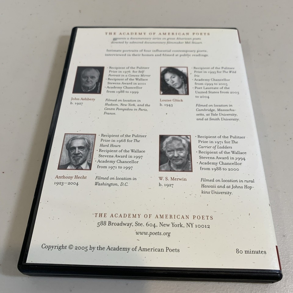 "The Poets View" is a documentary and biography movie presented by the Academy of American Poets. Released in 2005, this DVD features a tall/DVD case and is rated NR. The film showcases poetry and the views of various poets, including John Ashbery. It is in English language and is a standard edition DVD with NTSC video format, compatible with Region Code 1 (US, Canada). This DVD provides insight into the world of poetry through the eyes of renowned poets and offers a unique perspective on the art form.