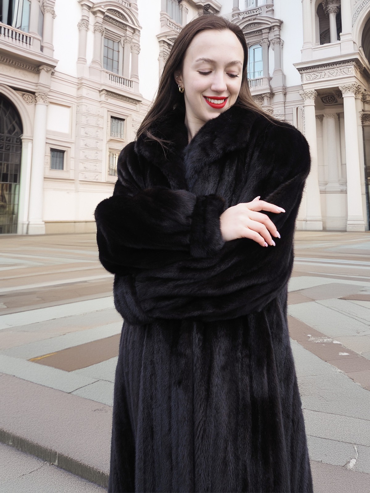 Like a shadow wrapped in silk, this NAFA ranch black mink coat moves with the elegance of midnight itself. Crafted from fully let-out female pelts, the fur is supple, whisper-soft, and rich with lustrous depth?proof of its premium NAFA lineage, comparable to Blackglama in quality and allure.