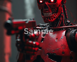 A menacing red combat android stands illuminated by cold, industrial light, its glowing eyes igniting the atmosphere with tension. Crafted with intricate mechanical detailing, exposed wiring, and battle-scarred plating, this cybernetic figure embodies the perfect fusion of futuristic design and unstoppable power. With its weapon raised and precision-built body poised for action, the machine radiates an intensity that feels both cinematic and chillingly real.