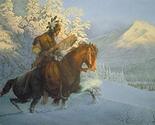 Product description: The Return is a signed and numbered limited edition print by Chuck DeHaan. A high plains scout on a deep sorrel horse in deep white snow is the striking contrast. Chuck's Indians in the snow scenes have been collector favorites, and "The Return" is undoubtedly one of his best. One can almost feel the surging steps of the heavy-breaking horse beneath him while the animal fights for each breath as he carries his laborious load in the cold, thin air. Even in freezing temperatures, a horse works up a heavy sweat under these conditions. This pair is obviously returning from a scouting jaunt, as shown by the "count cord" carried in the rider's lap across his heavy buffalo robe. Each knot in the rawhide cord represents an even number (5, 10 or 20) of buffalo, elk or the enemy - whichever or whomever is the subject of the scouting expedition. The knotted cord was the Indian's "tally sheet," a method of counting that was passed on to the white man, who used it in similar ways to number his livestock. Chuck's special use of lighting in this scene adds to the atmosphere we experience in sharing the scout's thankfulness in safely returning to the warm and welcome fires awaiting him at the camp below. Note the detail and study the artist gives to the horse's equipment, as well as the rider's striking regalia. The snaffle bit in the bridle was a sought-after trade item for the Indian horseman, who in this case has enhanced the headstall and reins by his own particular designs and attachments. This was a common practice among many of the plains tribes who developed entire cultures centered around horses. Image size is 17" x 25". Overall size is 20" x 28". It was published by Guild Hall in 1993 in a limited edition of 925. About the Artist: Chuck DeHaan is a sculptor and oil painter of present day cowboys in a traditional style. He has been interested in art since childhood. Self-taught at a young age, DeHaan has also worked with horses for most of his life.