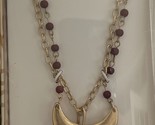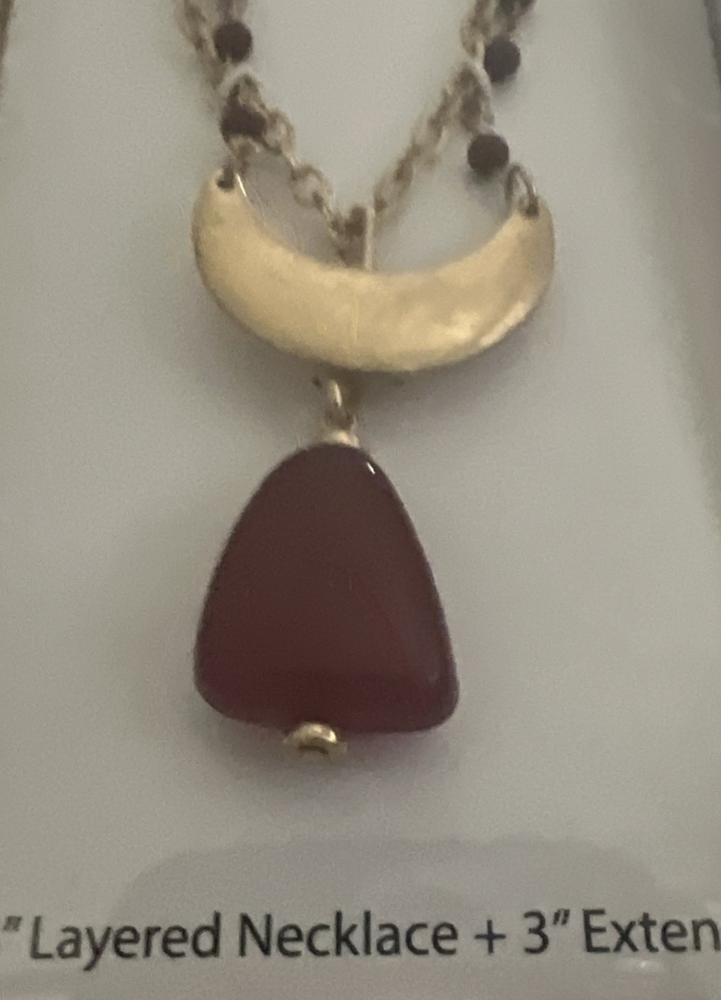 The Sak 16" Layered Necklace + 3" Extender is a gold-tone necklace with a crescent-shaped pendant and a larger burgundy-colored stone pendant.