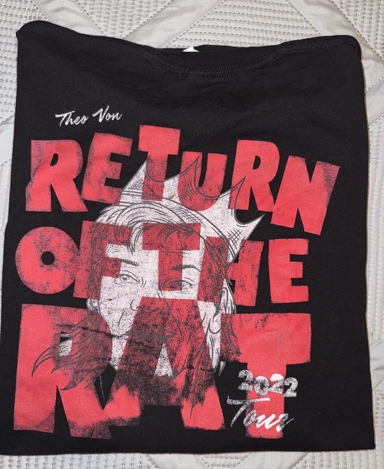 Get your hands on a piece of comedy history with this official Theo Von ?Return of the Rat? 2022 Tour t-shirt. Featuring bold red and white graphics of Theo himself layered with dynamic text across the front, this tee celebrates his unforgettable stand-up tour. The front chest area also has a smaller version of the design for subtle flair.