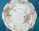 Theodore Haviland 5-1/2" saucer, decorated with pink flowers and green leaves and with gold markings on the rim. Marked in red, Theodore Haviland, Limoges, France, Patent Applied For and with Denholm McKay Co, Worcester, Mass. The saucers are in excellent condition and look new.