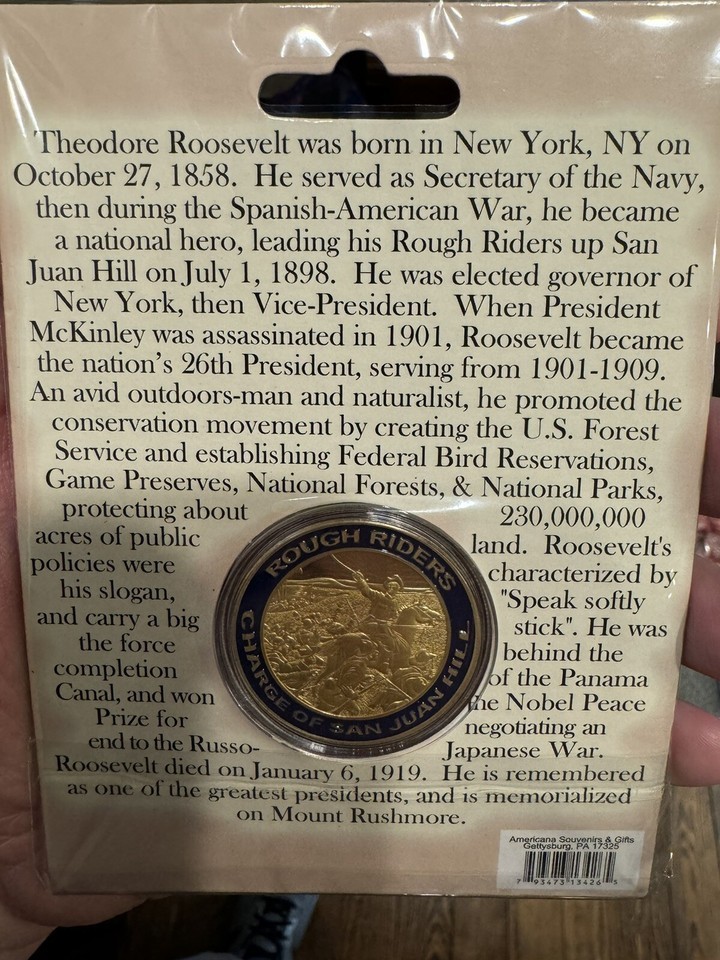 This collectible item is a must-have for any history enthusiast or collector of presidential memorabilia. It is a tangible reminder of the impact that Roosevelt had on American politics and his lasting influence on the nation. Add this Theodore Roosevelt commemorative coin to your collection today.