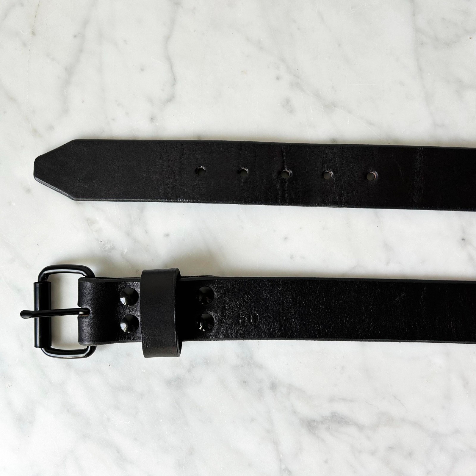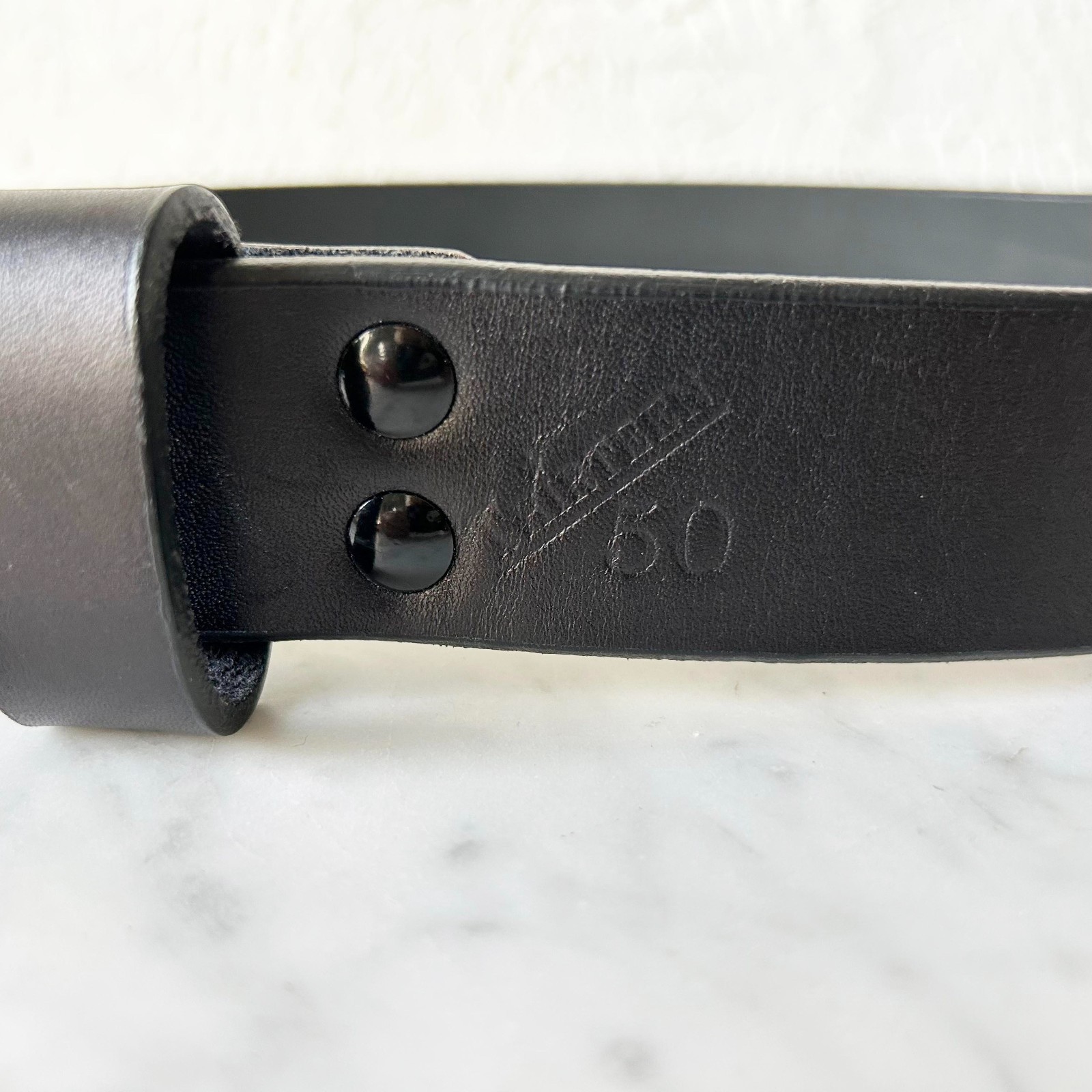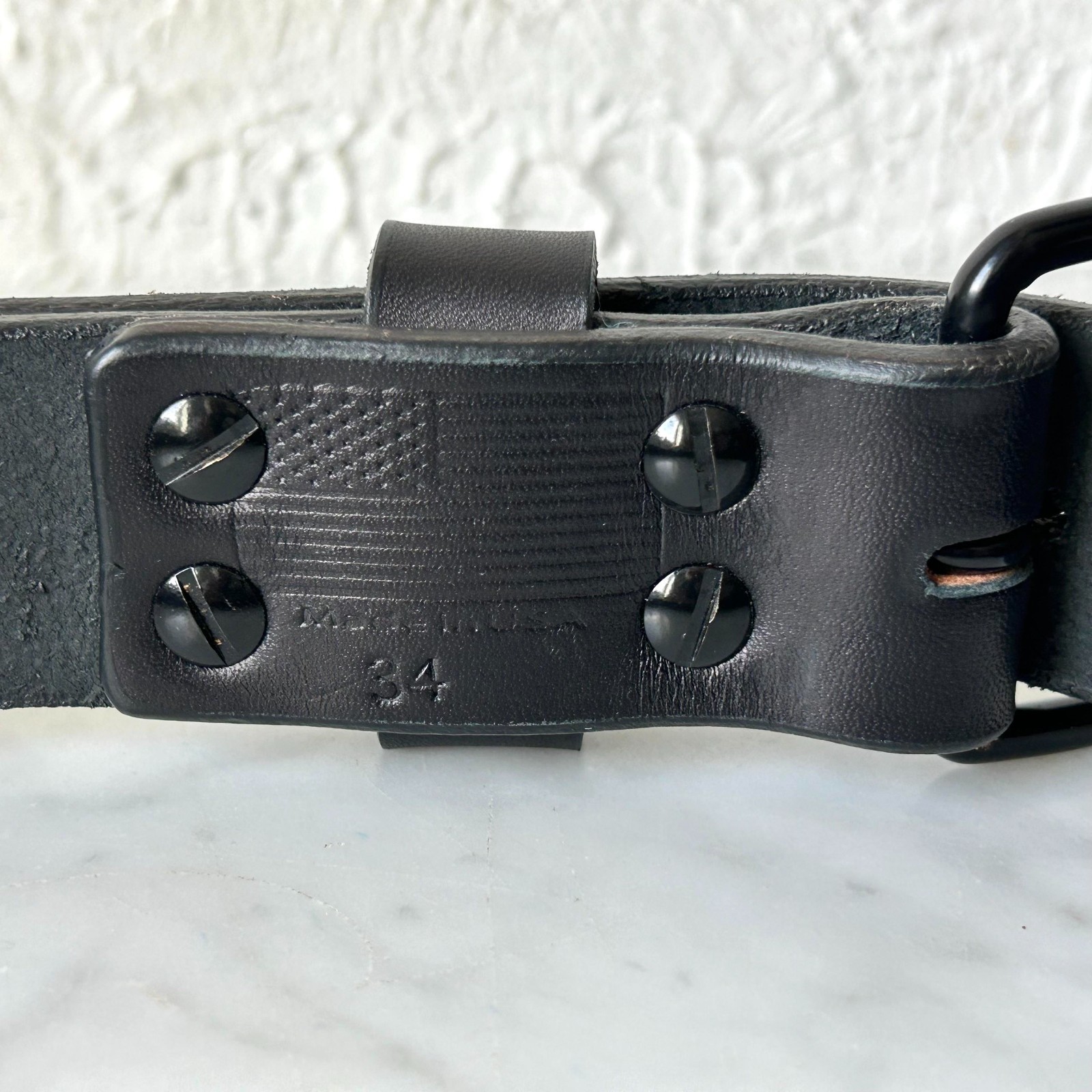 Thirteen50 full grain black leather belt, size 34. Strap is cut directly from 10-12 oz hides. The edges are then hand burnished and waxed, giving the belt a clean finished edge. Four Chicago screws are set to hold the buckle. Five holes are set in 1" intervals for size adjustments. Belt measures 40" long x 1-1/2" wide. Excellent condition.