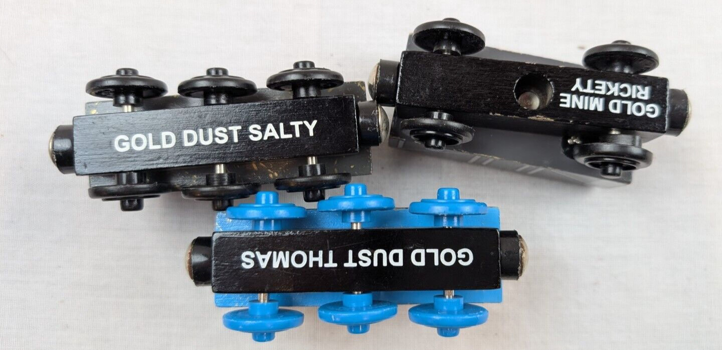 Up for sale is a Lot of 3 Thomas Friends Wooden Railway trains -- Gold Dust Thomas, Gold Dust Salty Gold Mine Rickety all with their cards.