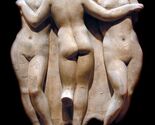This is a reproduction of an ancient sculpture of the Three Graces (here shown two of them together). The Three Graces (Charites) were the goddesses of charm, beauty, nature, human creativity and fertility. They were great lovers of beauty and gave humans talents in the arts, closely associated with the Muses. They were the daughters of Zeus and Eurynome, usually, though also said to be daughters of Dionysus and Aphrodite or of Helios and the naiad Aegle. Homer claimed they were part of the retinue of Aphrodite. Their Roman equivalent were the Gratiae.