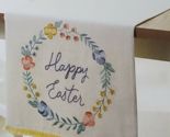 Neutral colored background with multi-colored embroidered flowers and the words Happy Easter in cursive writing