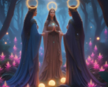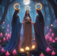 wise women who each hold one arc of the sacred triad: the Flame of Fortune, the Root of Blessing, and the Breath of Peace. When they gather, they do so under a crescent moon with the Winds of the East stirring, the Flames of the South burning, the Waters of the West humming, and the Stones of the North anchoring the field.