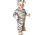 It's a kids Halloween costume straight from the wild! This adorable toddler white tiger costume is perfect for a night of trick-or-treating. Polyester.Includes:? Light plush fully screen printed black striped jumpsuit? Detailed gloves and feet? Fully detailed hood? Realistic eyesMade in the USA.