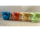 Set of four full-size heavy ceramic Moai mugs by Tiki Farm, made in Mexico. Includes blue, orange, yellow, and green. Each mug has the classic Moai face design with horizontal ribbing and a bright glossy glaze. These are substantial in weight and well crafted. No chips, cracks, or repairs noted. Light ceramic variations and minor shelf wear may be present. This matching color set displays beautifully and is ideal for tiki bars, home bar shelves, Polynesian pop decor, or cocktail service. These mugs are discontinued and hard to find as a complete group.