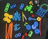 Random lot of 64 plastic tinker toy replacement parts plus one wood piece.