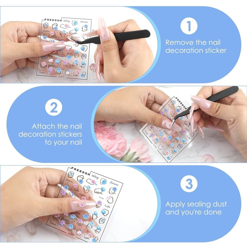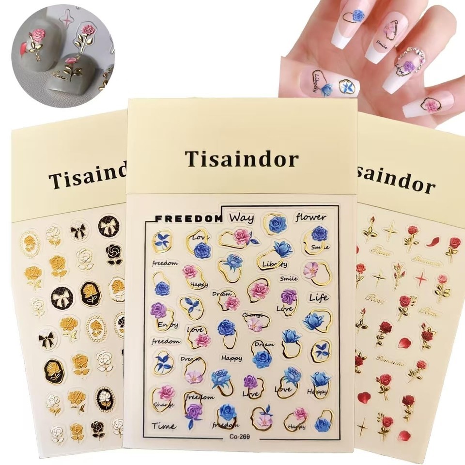- Tisaindor 5D Embossed Flower Nail Art Stickers 3 Sheets Rose Colorful