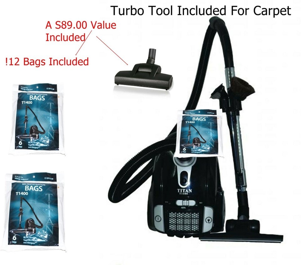 - Titan T1400 Turbo Compact Canister With Cord Reel Bagged Hepa Filtered w 12 bags