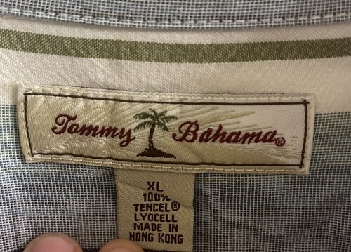 This listing is for a Tommy Bahama Button Down Shirt Mens XL Stripe Blue White Green Long Sleeve. Very good condition - two little thread dots on front as shown in photo-and comes from a smoke free home!