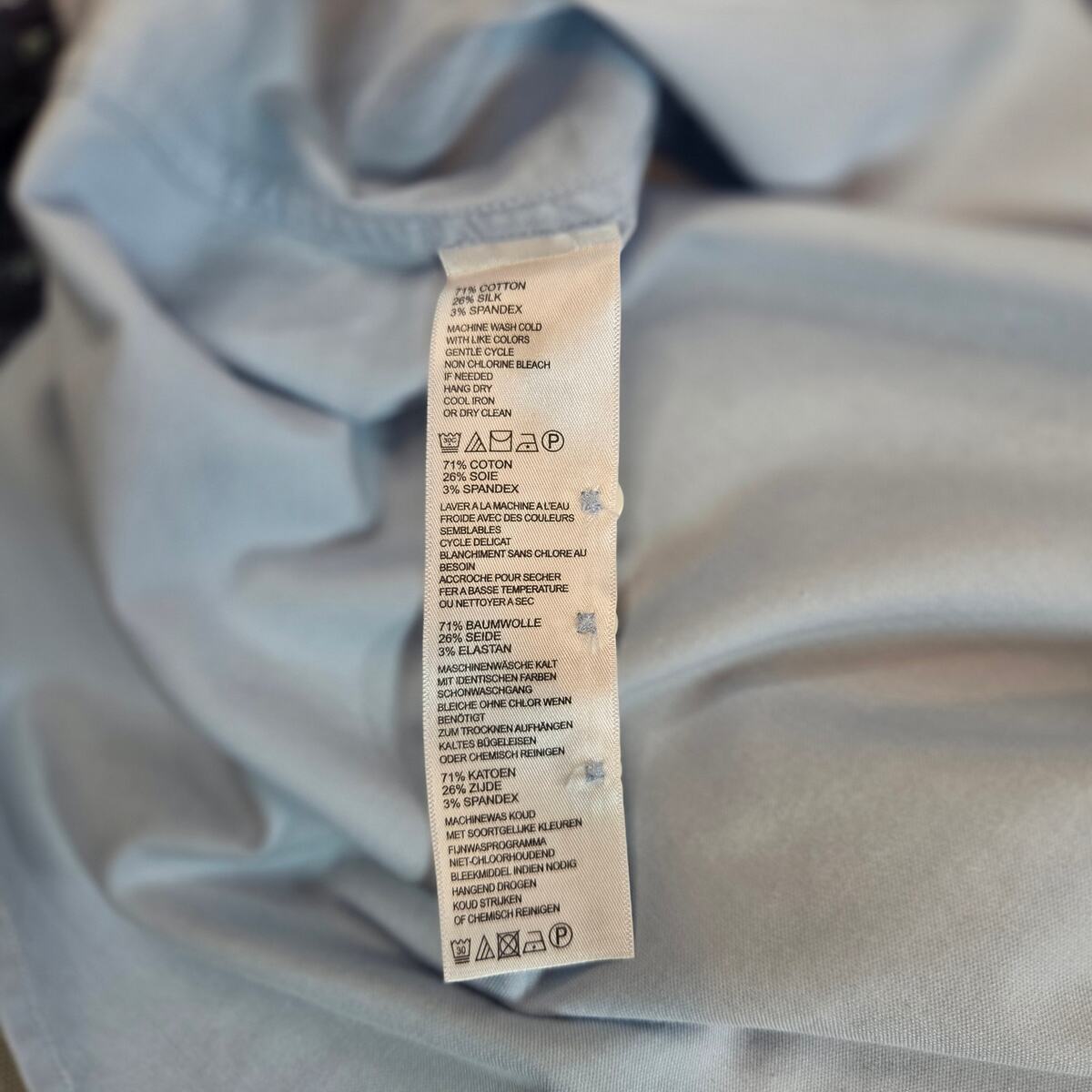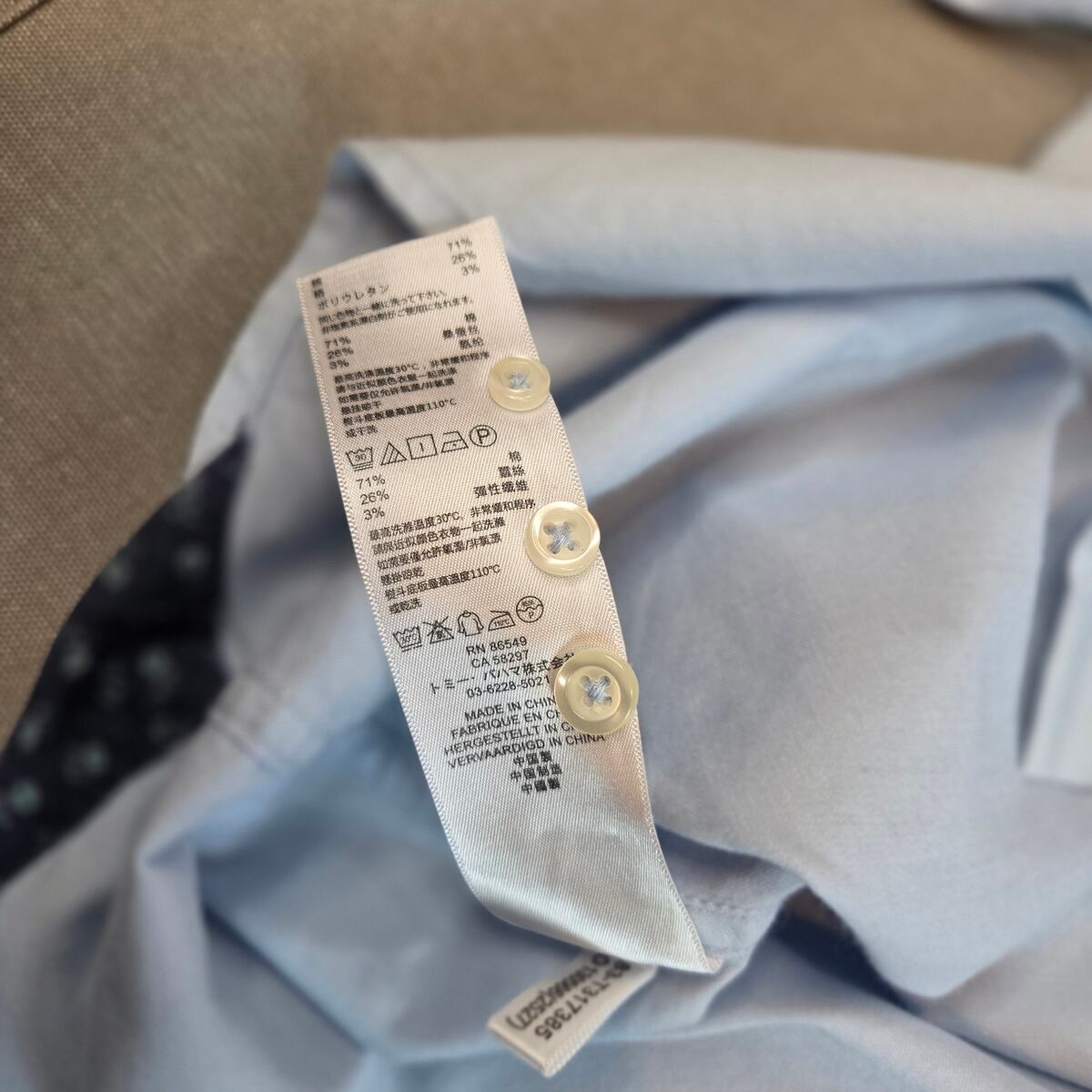 Tommy Bahama men?s long sleeve button-up shirt crafted from a premium cotton, silk, and spandex blend. Features contrast gingham fabric inside collar and cuffs, giving it a clean yet relaxed island look. Soft texture with light stretch for comfort. Excellent overall condition with no visible flaws, stains, or fabric wear.