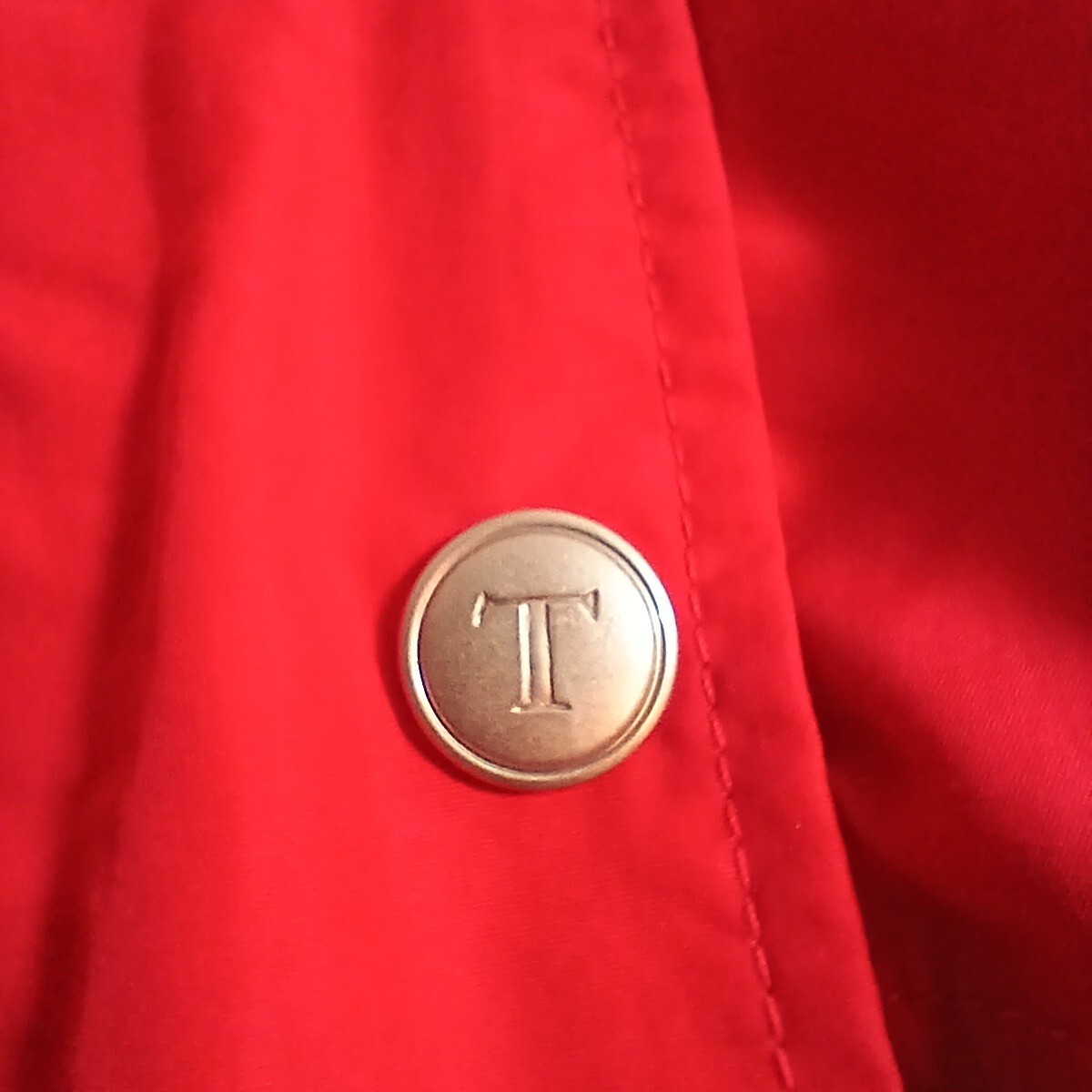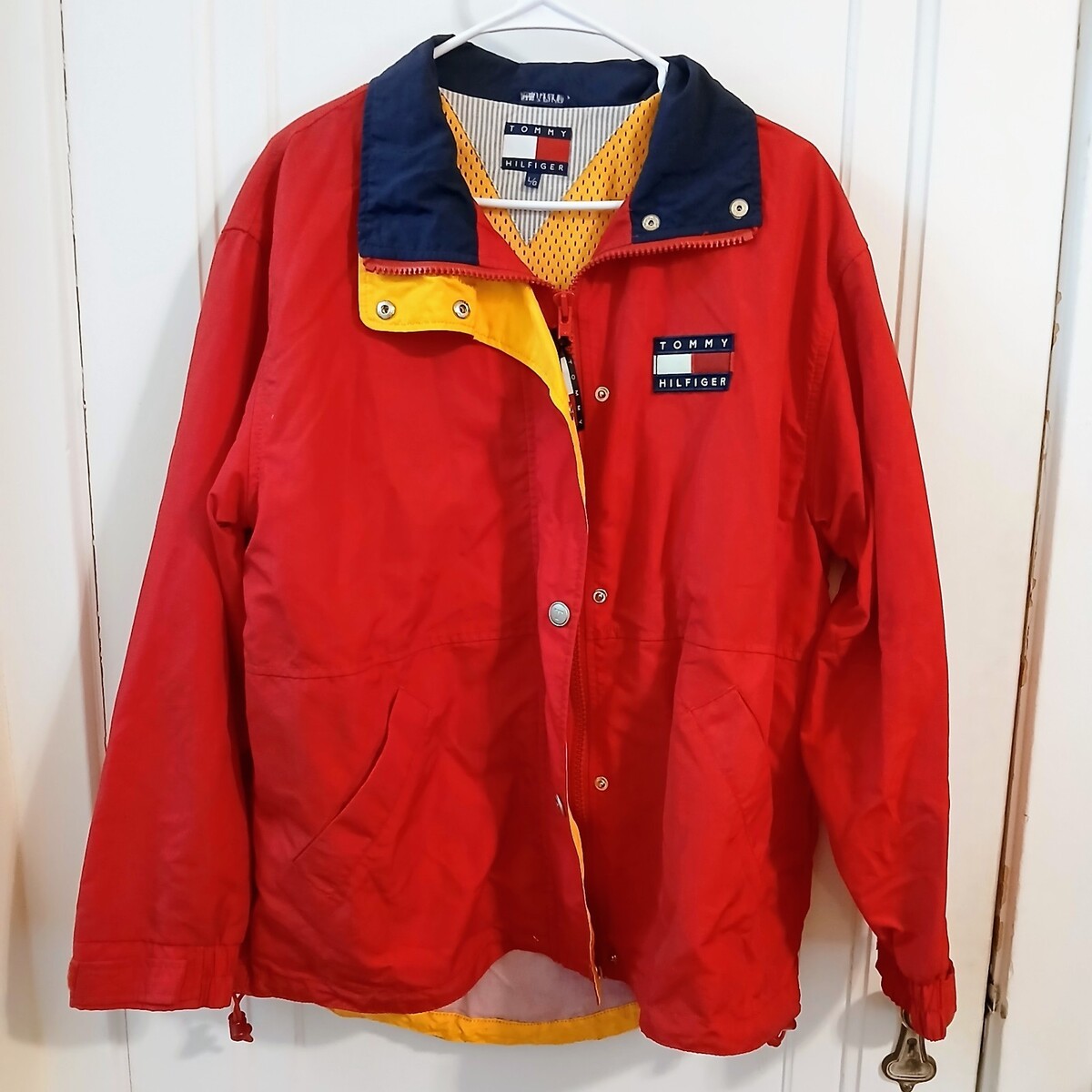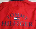 Classic red shell with yellow and navy interior trim, mesh lining, and full-zip front with snap buttons. Features embroidered Tommy Hilfiger chest logo and big spell-out logo across the back. Heavy YKK zipper, adjustable drawstring hem, and two front pockets.
