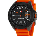 Black- tone stainless steel case with a orange silicone strap. Fixed black resin bezel. Black dial with black and orange hands and index hour markers. Arabic numerals mark the 6 and 12 o'clock positions. Minute markers around the outer rim. Dial Type: Analog. Luminescent hands and markers. Date display at the 3 o'clock position. Quartz movement. Scratch resistant sapphire crystal. Pull / push crown. Solid case back. Case diameter: 46 mm. Case thickness: 11.4 mm. Round case shape. Band width: 22 mm. Tang clasp. Water resistant at 50 meters / 165 feet. Functions: date, hour, minute, second. Sport watch style. Tommy Hilfiger Cody Black Dial Orange Silicone Men's Sports Watch 1791205.