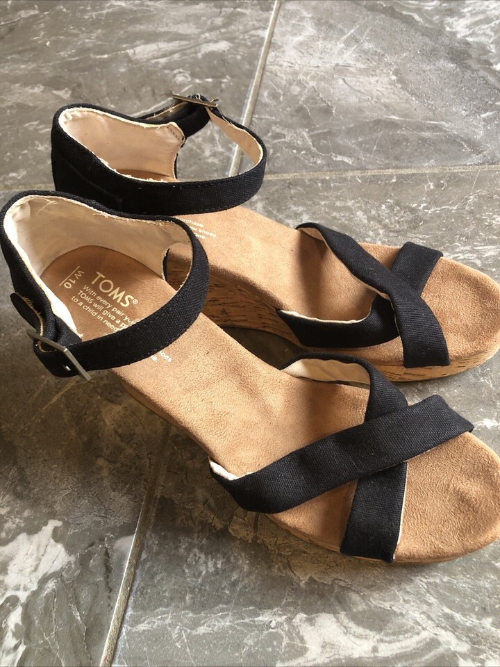 - Toms Women’s Sandals Sz 10 W Black Tan Sienna Wedge Heels Espadrille Ankle Strap