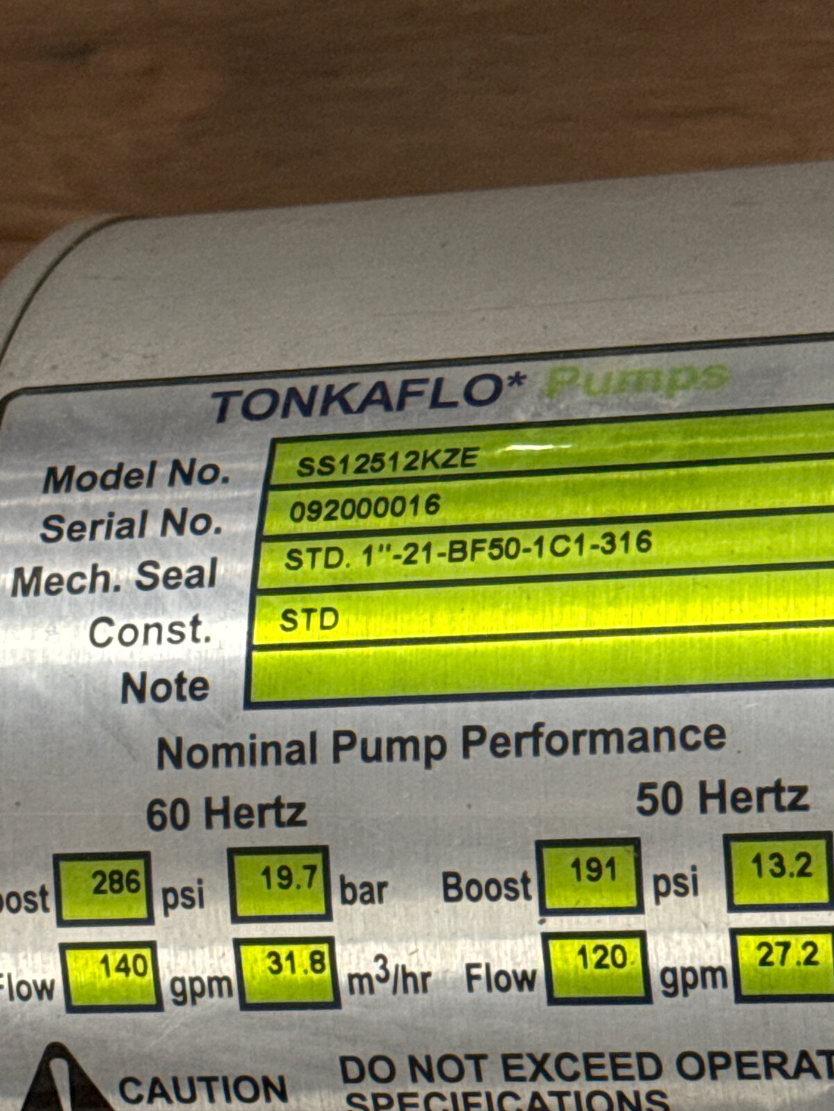- Tonkaflo SS12512KZE Pump 286 psi 140 gpm