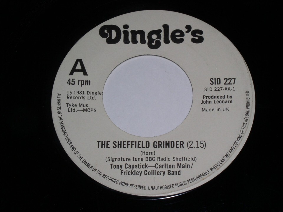 This is an original, vintage 45 rpm phonograph record by Tony Capstick Carlton Main Frickley Coilliery Band entitled, "Capstick Comes Home". Flipside: "The Sheffield Grinder". Record label Dingle's SID 227. Note that this has the large center, rather than the more common small spindle center.
