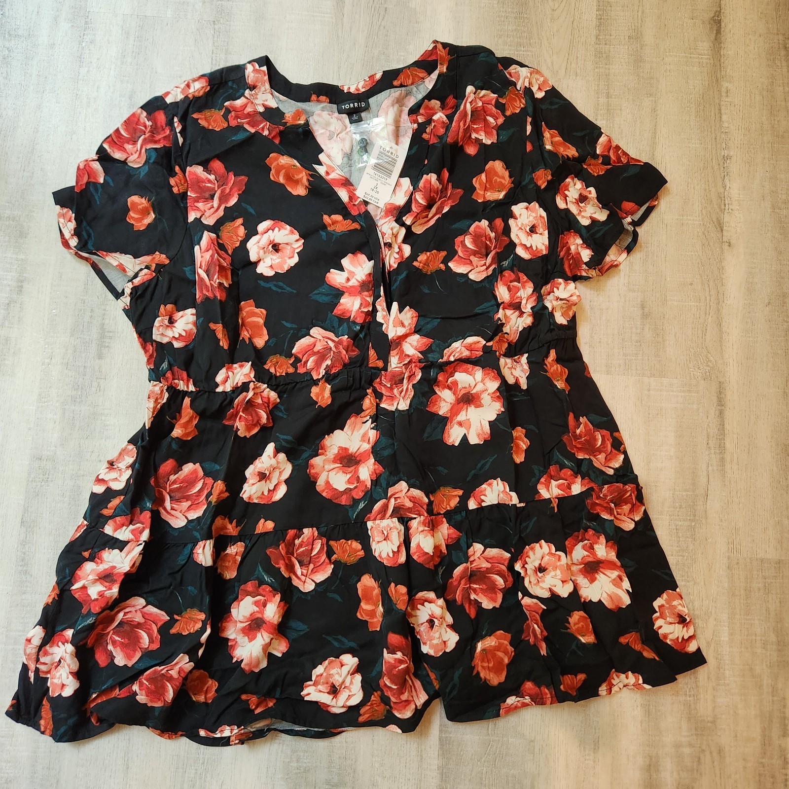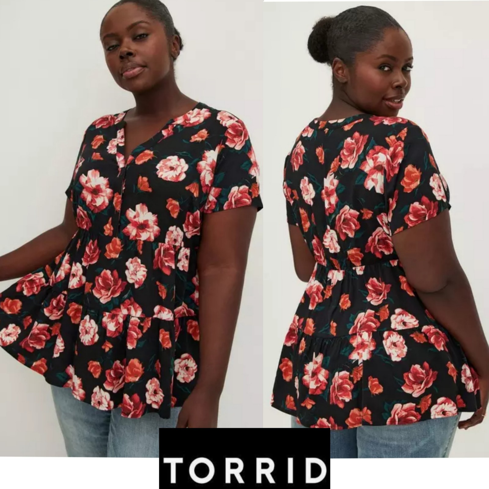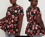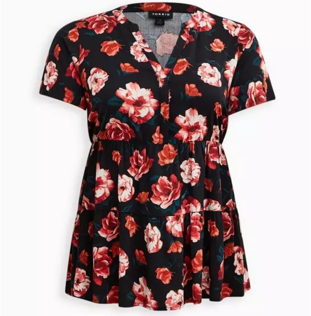 - Torrid Plus 2X Babydoll Rayon Twill Button-Front Tiered Top Black Floral