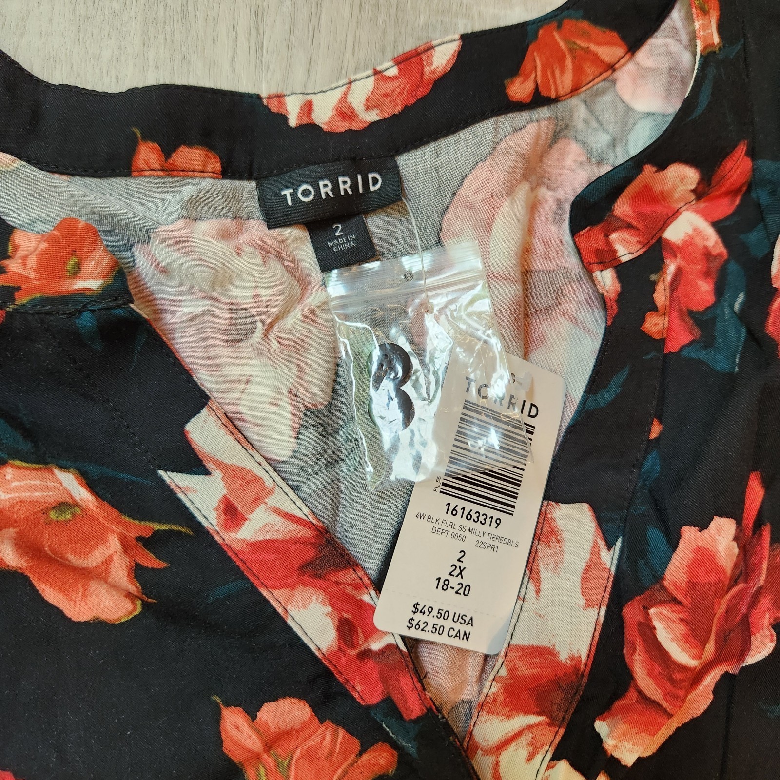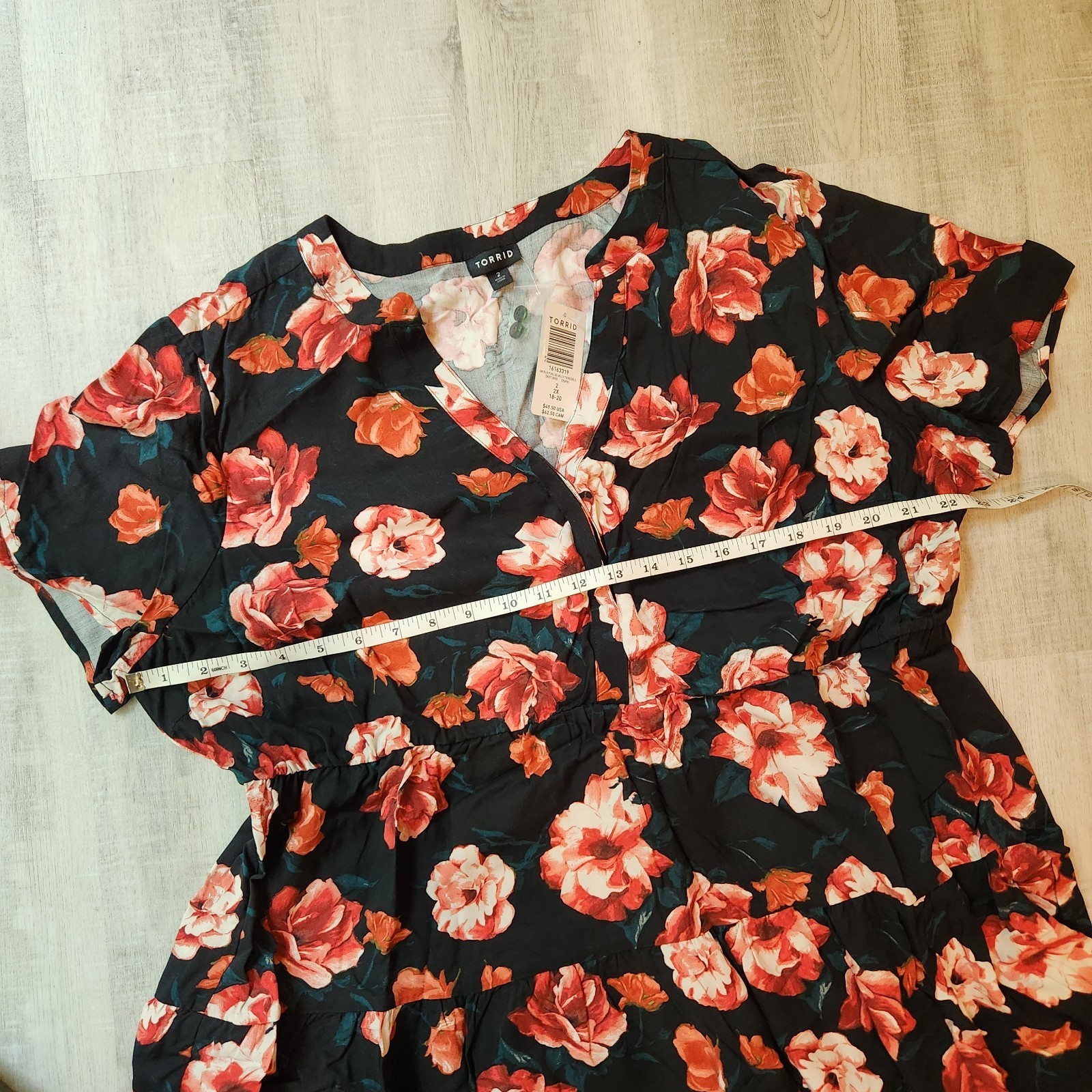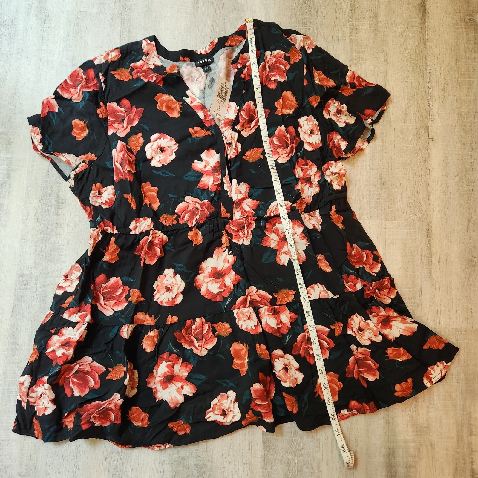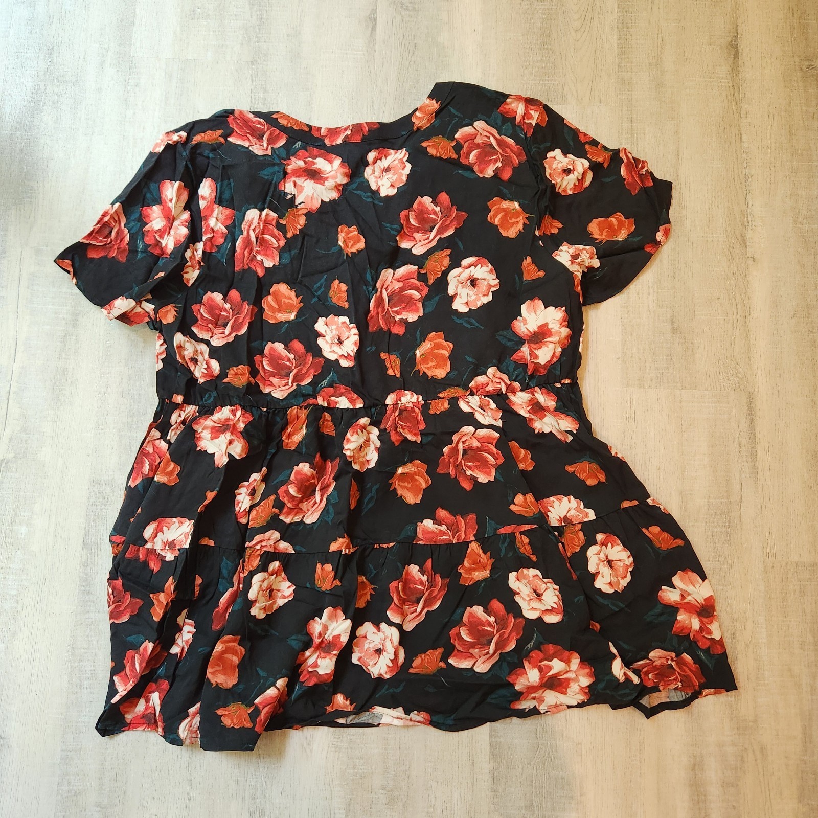 - Torrid Plus 2X Babydoll Rayon Twill Button-Front Tiered Top Black Floral