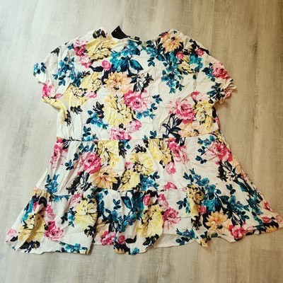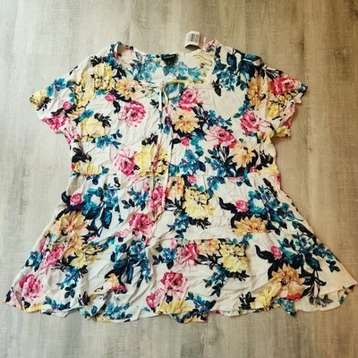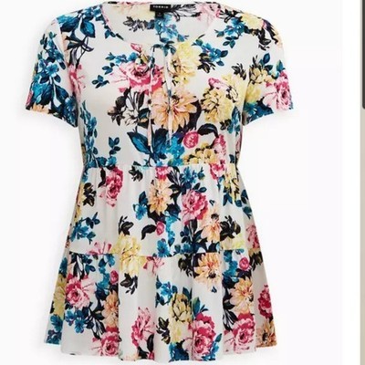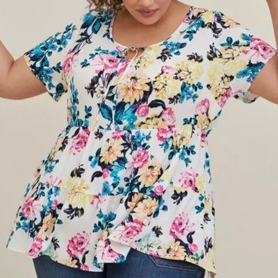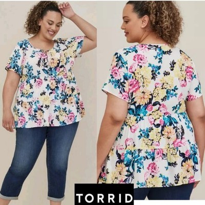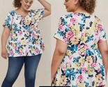 - Torrid Tie Front Babydoll Tunic Textured Stretch Rayon White Floral Plus Size 1X