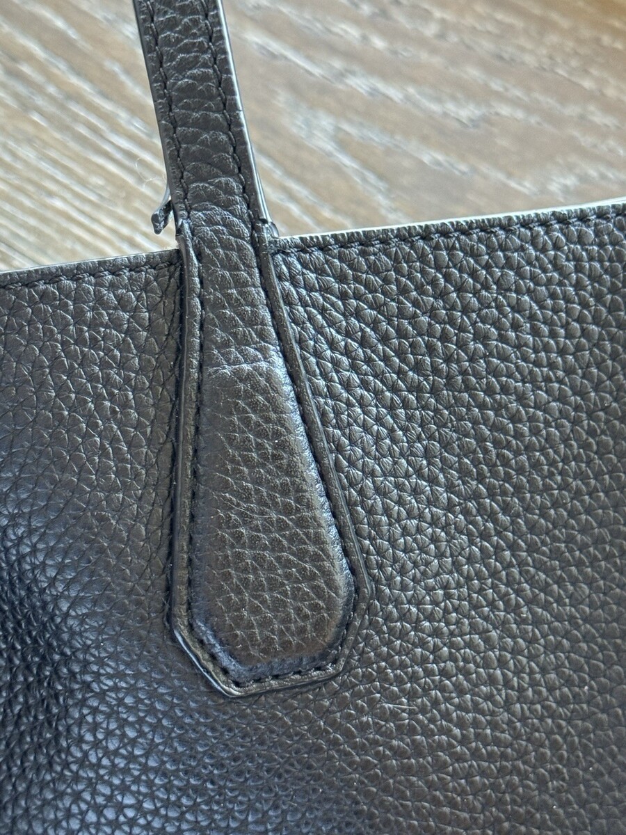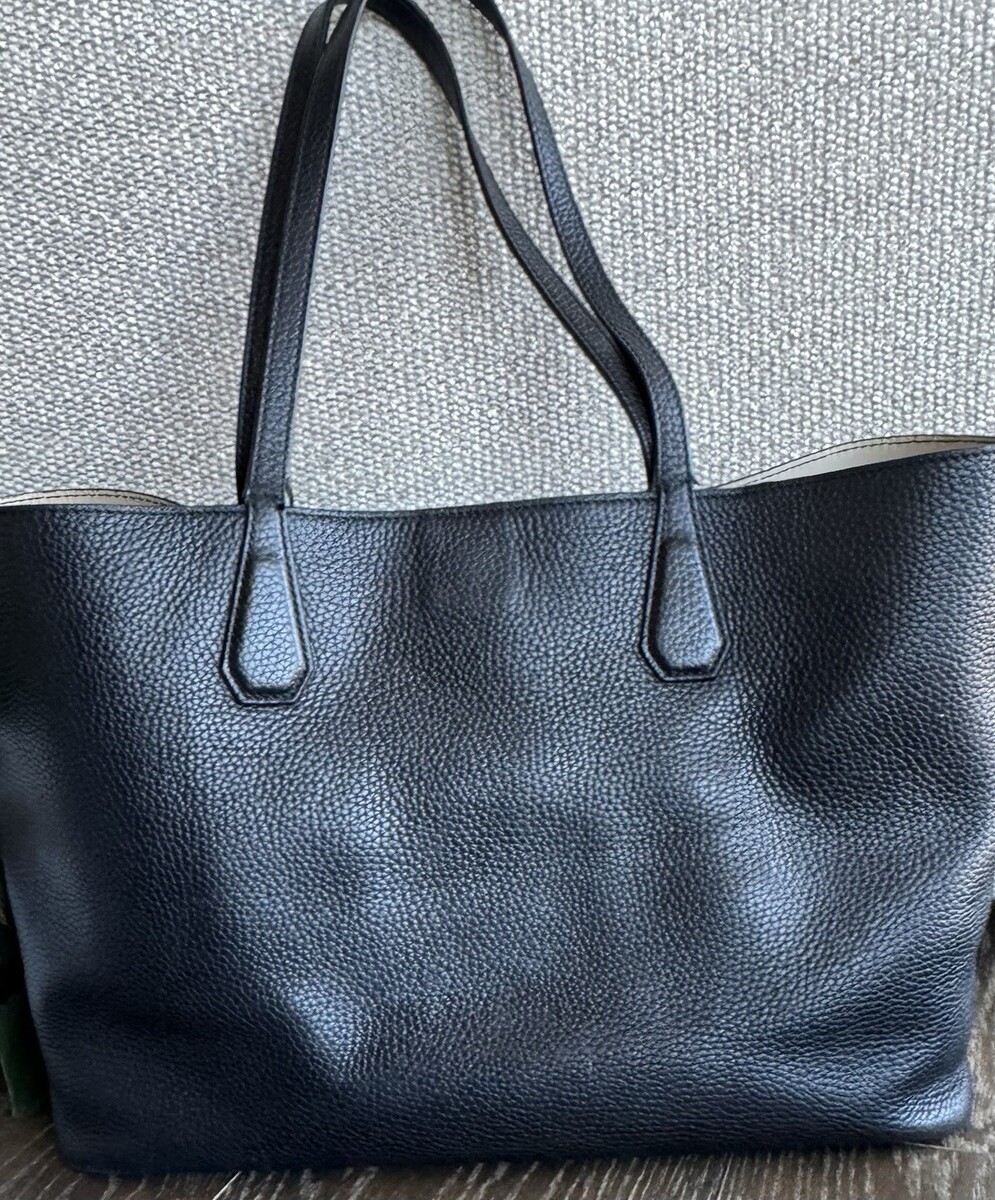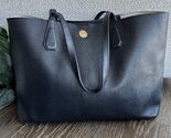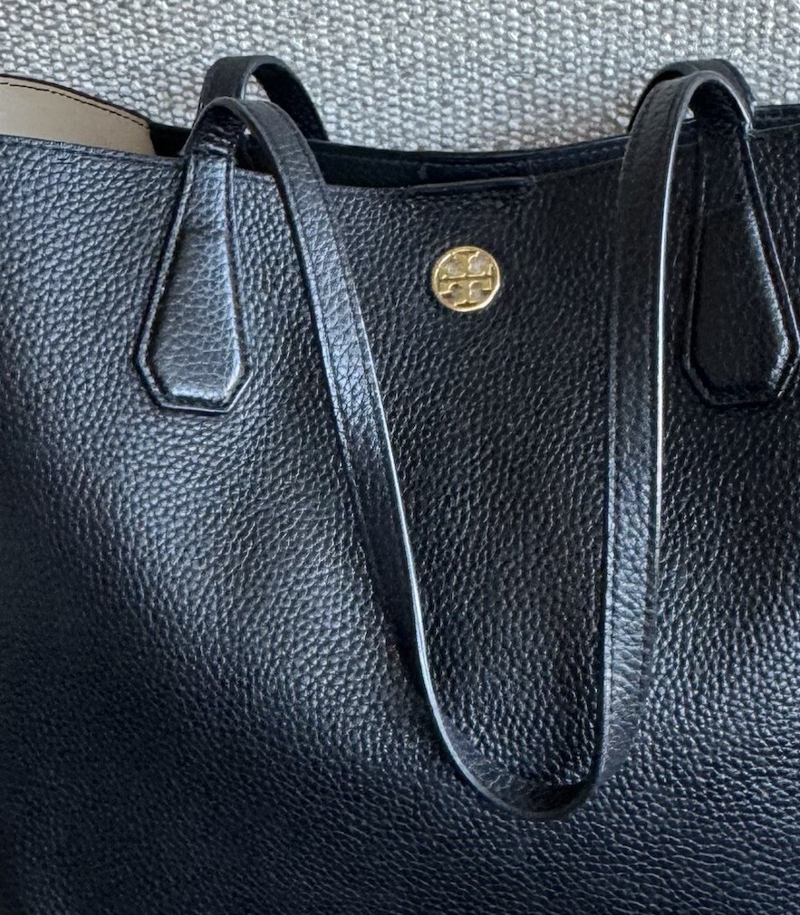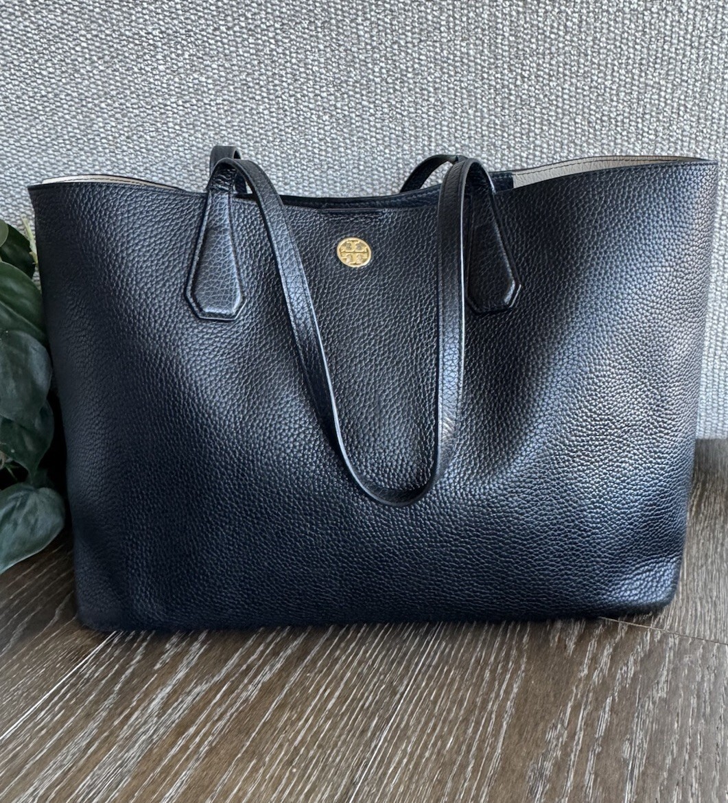 - Tory Burch Tote Bag Large Black Pebbled Leather 15" x 11" Double Strap Snap READ