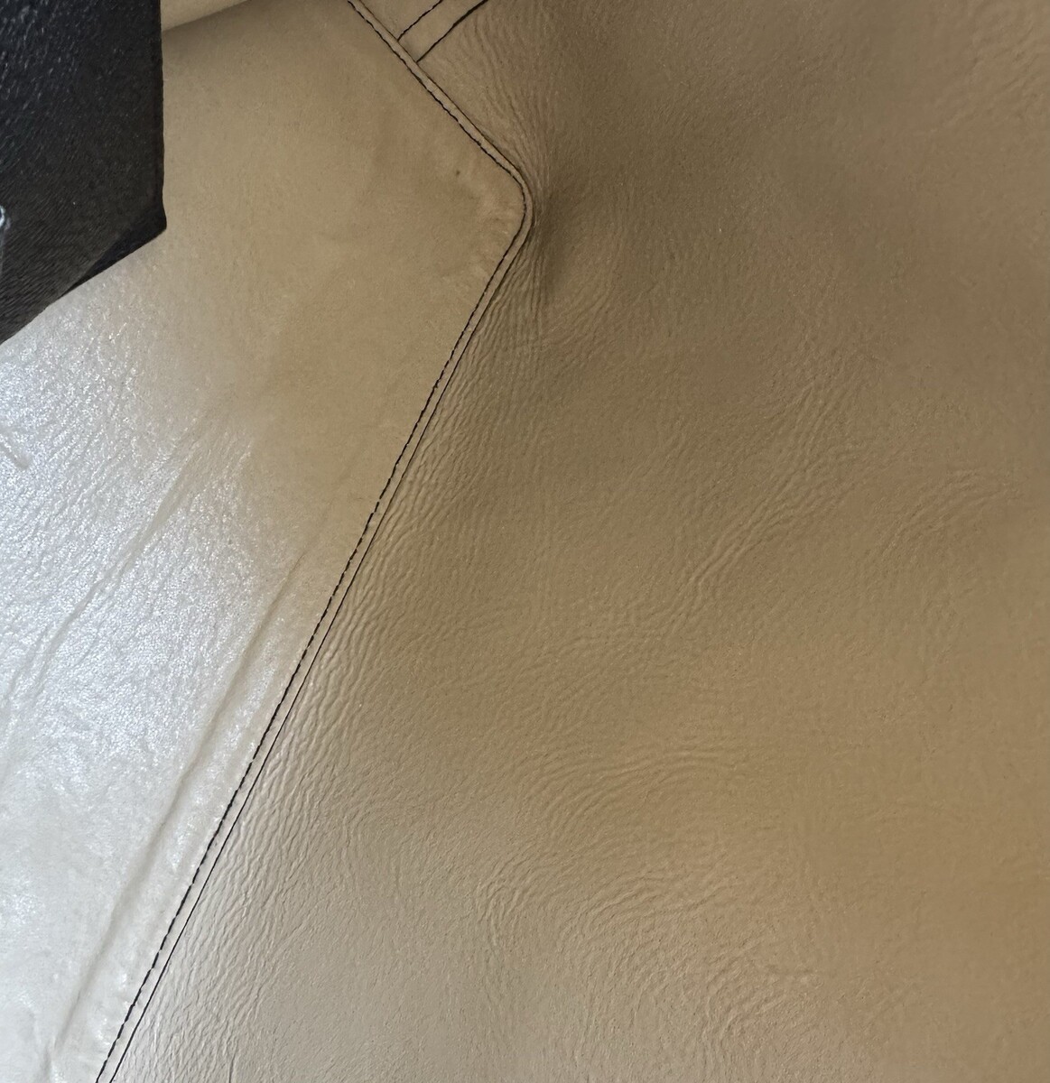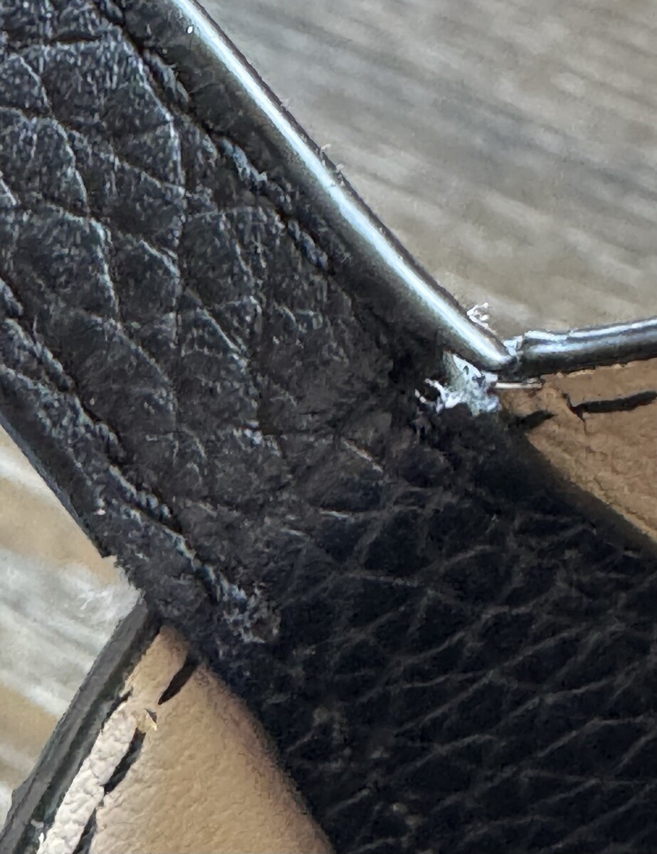 This bag has a lot of life left in it, however, two of the straps have some separation of the edges (see photos). This does not affect the durability of the straps. There is also wear on the bottom corners (see photos) - not obvious unless you search for them. Overall, the leather is in good condition and the inside is clean.
