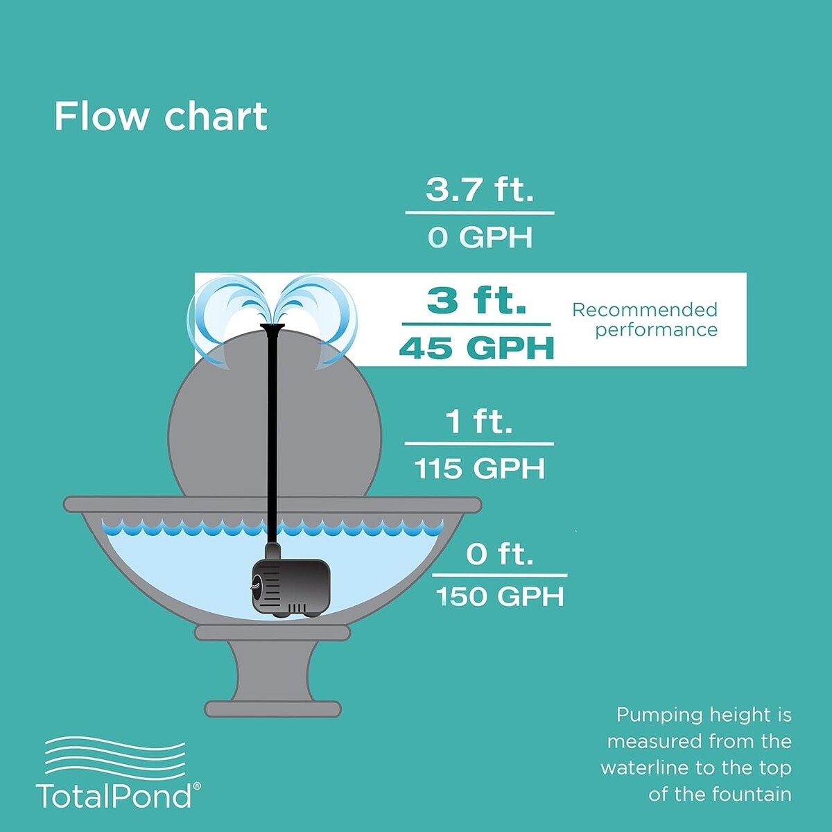 Power small fountains! The TotalPond 140 GPH Fountain Pump is ideal for fountains with 3 ft. pumping height. Pumping height is measured from the water level to the outlet of the fountain.
