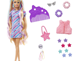 Barbie doll has 8.5 inches of extra-long playable hair and comes with 15+ additional pieces: 8 are color change hair clips, a comb, 1 set of hair ties, 2 scrunchies, metallic vest fashion, purse, sunglasses and a necklace
