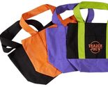 Product description: Get into the Halloween spirit with these charming mini canvas tote bags from Trader Joe's, featuring festive black, orange, purple, and lime green colors. Perfect for trick-or-treating or everyday use, each bag measures 13 inches long, 11 inches tall, and 6 inches deep - an ideal compact size for carrying essentials. The durable canvas construction includes convenient dual handles extending 17 inches for comfortable carrying, plus a front pocket and main compartment for organizing your items. These limited-edition totes showcase an embroidered Trader Joe's logo and offer an unlined, open-top design for easy access. The versatile bags are machine washable in cold water and should be dried flat for easy care. Made in Vietnam, these unisex totes are suitable for adults and make delightful collector's items for the autumn season. Whether you're collecting Halloween treats or running daily errands, these practical canvas totes combine seasonal charm with everyday functionality. Each bundle includes multiple color variations, perfect for building your collection or sharing with friends.