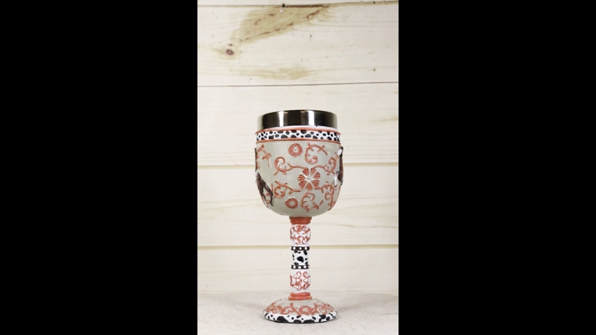 ? This stunning Painted Pony pays tribute to the "Art of Leather." Cowboys who drifted with the winds across the great plains were the first leather artisans. At the end of their long days, they would sit by the fire and create masterpieces with great love, using the only canvas they could find: longhorn leather. "Western Leather " captures the romance of the American West.. These symbols and elements are all infused into the body of this wine goblet.