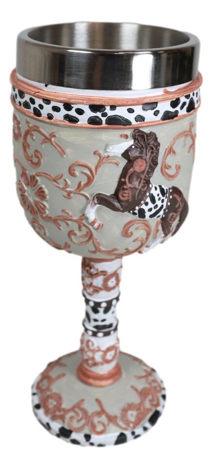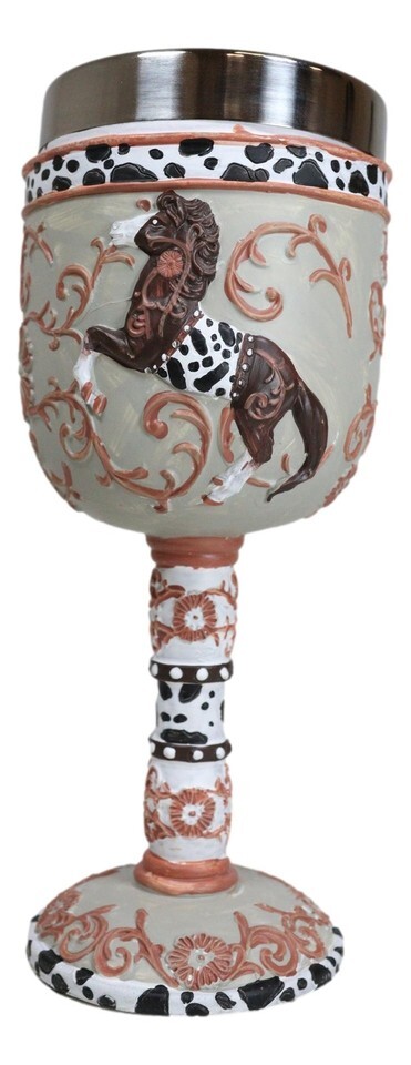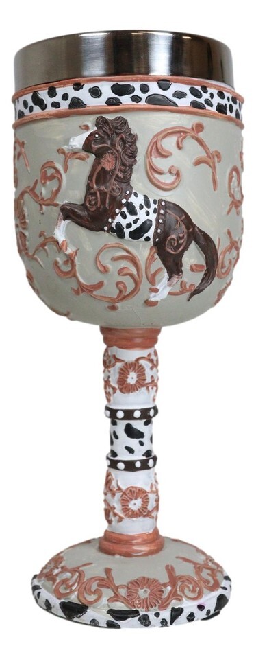 ? This Featured Trail Of Painted Ponies Wine Goblet is made of high quality resin with stainless steel liner, individually hand painted and polished. Color Tone May vary from pictures. Handwash only, applying soap to the stainless steel liner cup but using warm water/very mild soap on the resin housing.