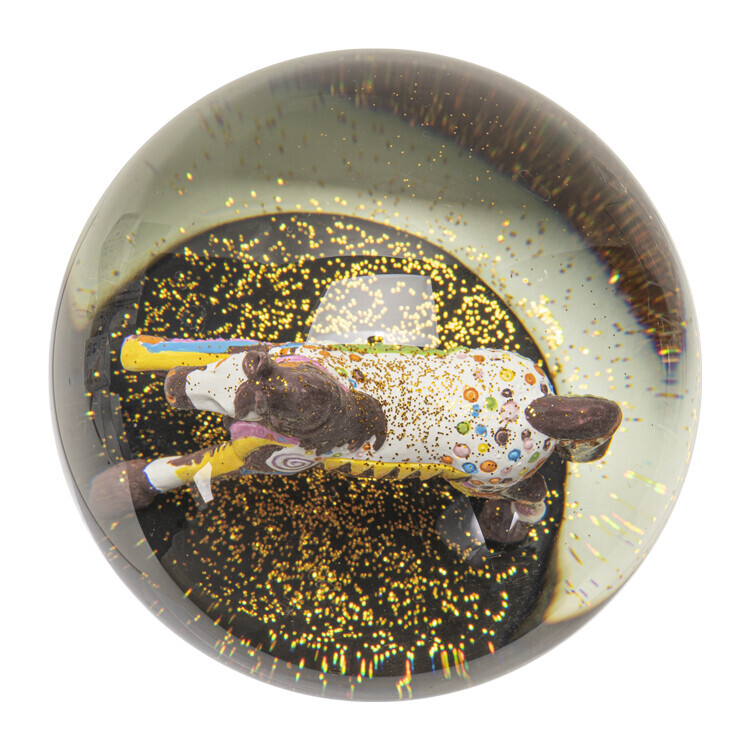 ? This Trail Of Painted Ponies Water Globe measures 5.25" tall, 4" wide and 4" deep approximately. The globe spans 100mm (about 4"Inches). It weighs about 2 pounds.