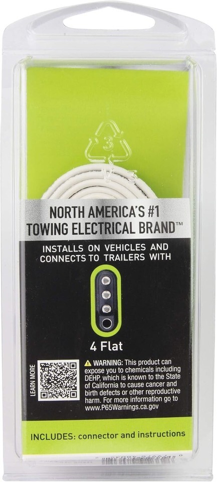 Basic connector, 4 wire flat vehicle end, 48 in color coded wires. Printed wire functions for color blind and color fading. Corrosion resistant terminals, meets SAE standards.