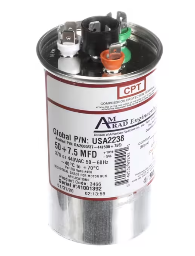 The Trane USA2238 Capacitor (also known as 41001392) is a dual run round capacitor rated at 50 + 7.5 MFD for 370/440 Volt applications. It is built to support both compressor and fan motor functions in HVAC systems, ensuring reliable start-up and efficient operation. Designed for durability and performance, this component is a high-quality OEM replacement.