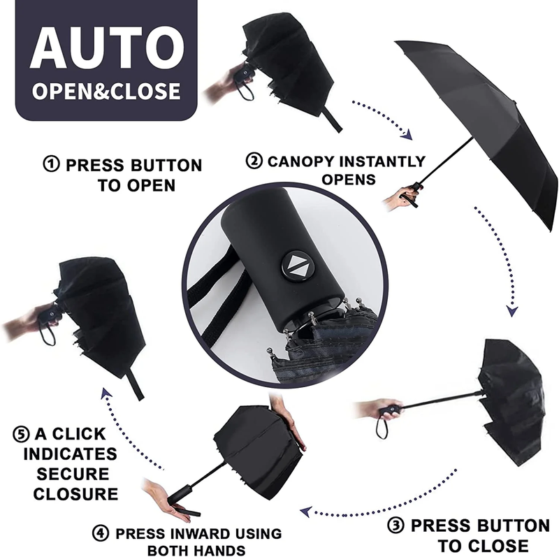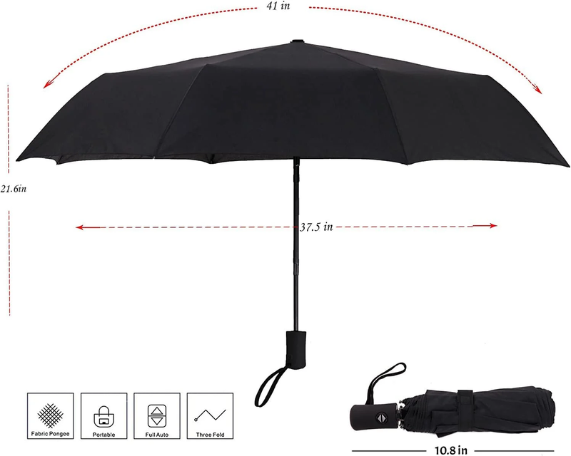 SPECIFICATIONS Canopy Diameter: 42in Effective Diameter: 37.5 in Folded Size: 11.8 in Weight: 0.71lb 5.Color Black: an elegant and classic color choice Service Guarantee: free exchange for any quality problem Auto Open Umbrella: one-touch switch for easy use Waterproof and Windproof: suitable for all weather conditions Compact and Lightweight Portable: fit easily into briefcases, purses, handbags 8 Reinforced Fiberglass Ribs: withstand sun, rain, snow, and light wind