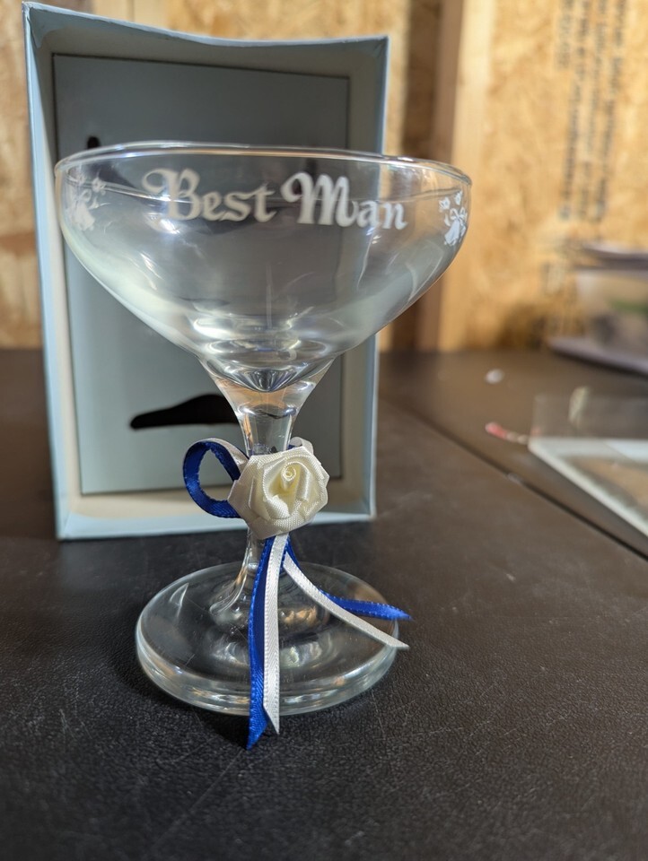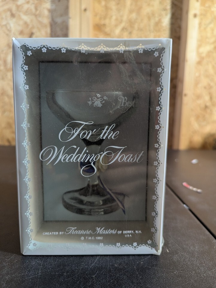 The Treasure Masters Best Man Crystal Toast Glass is a vintage cocktail glass shaped like a round, stemmed glass with a clear design perfect for weddings. Hand-painted and adorned with a painted wedding theme, this original 1982 glassware piece is a unique addition for any collector or for use as a special toast at a wedding ceremony. Made in the United States, this glassware item comes in a presentation box, adding a touch of elegance to any table setting.