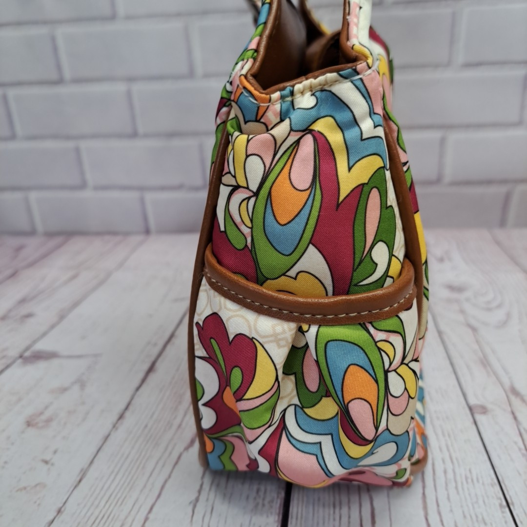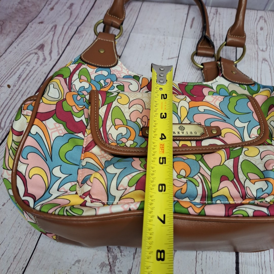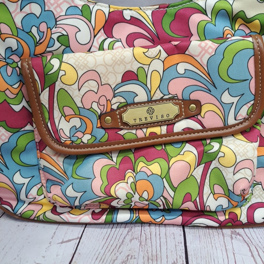 This is a medium-sized Treviso purse handbag with a multicolored floral pattern and tan trim. The exterior is made of canvas with brown handles and goldtone hardware. The interior lining is brown, and it is designed for women's use.