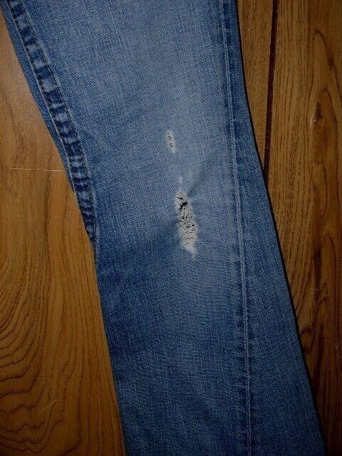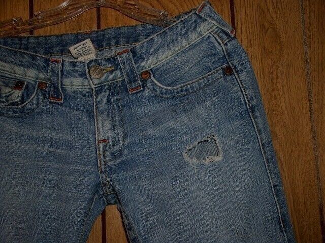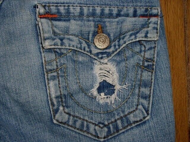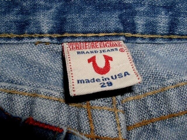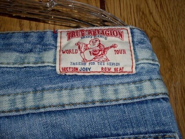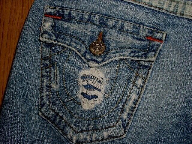 This is a pair of True Religion distressed denim jeans. Style is Joey, size 29. They have a flared bottom as shown. Made in U.S.A. and are 100% cotton. Lots of photos to show distressed areas, so no confusion as to condition. Being distressed, it's difficult to accurately grade these, but they appear to have been gently worn and I would say in excellent overall condition.