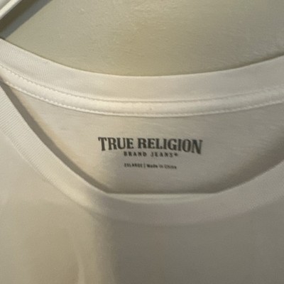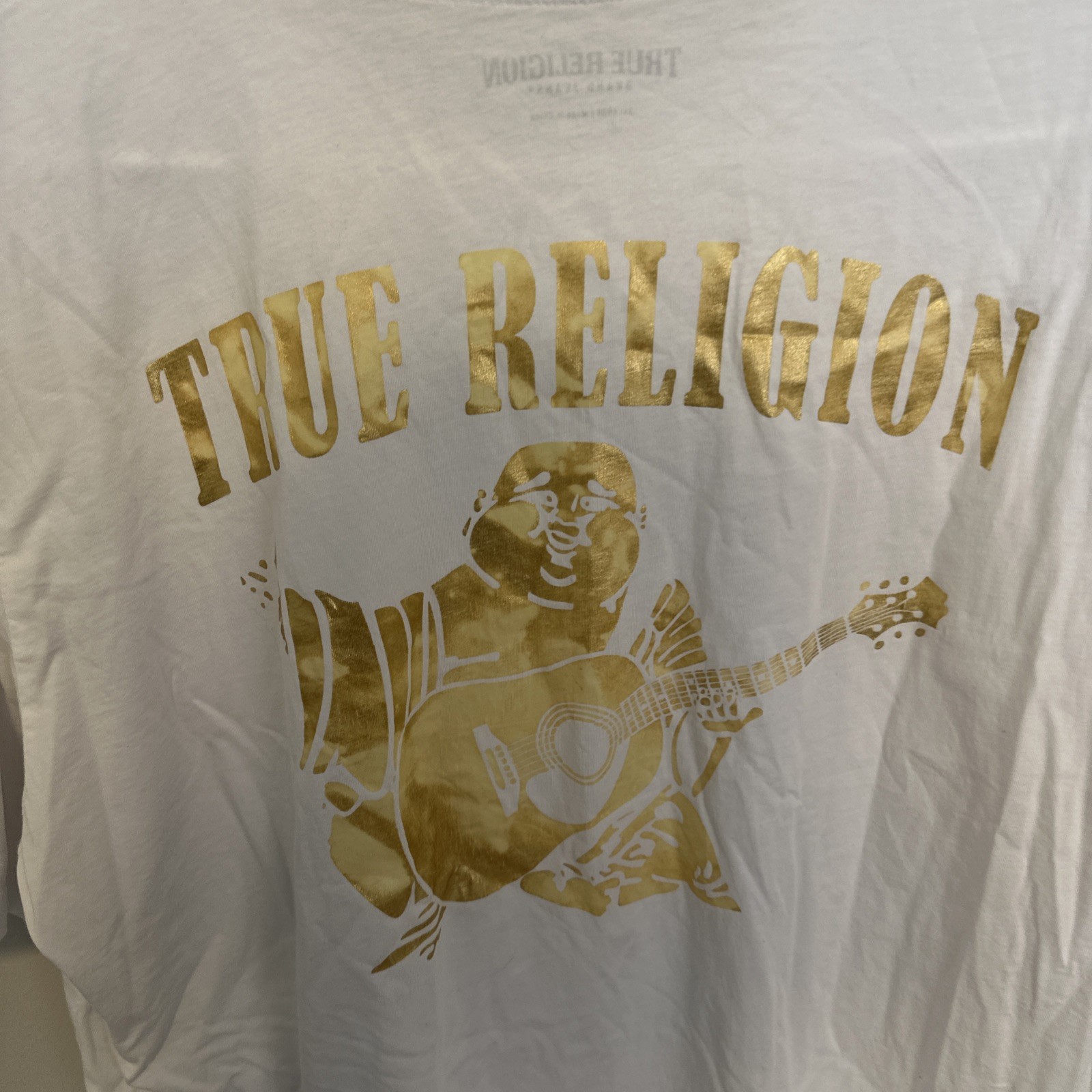 - True Religion T-shirt Men Size 2XL White Gold Monk Embossed Logo Metallic