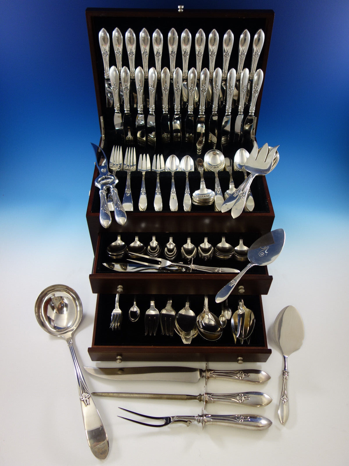 Monumental Dinner size "Tulipan" by Frank Smith circa 1933 sterling silver Flatware set, 193 pieces. This rare set has an outstanding variety of place pieces and serving pieces and includes: