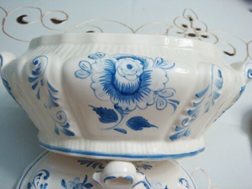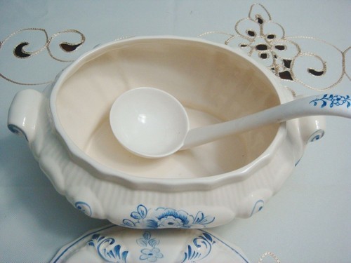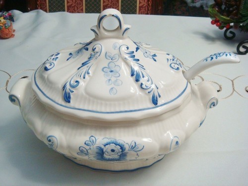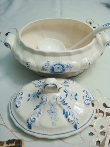 Tureen made in Portugal, covered with ladder server spoon, 9 1/2" tall 11" long 8" wide with ladder, very good condition, looks new [120M]