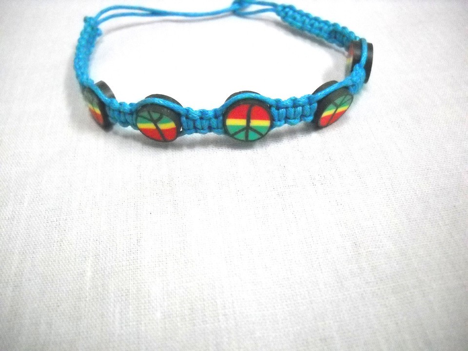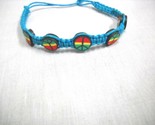 - TURQUOISE BLUE MACRAME w RASTA COLOR PEACE SIGN BEADS REGGAE TIE BRACELET ANKLET