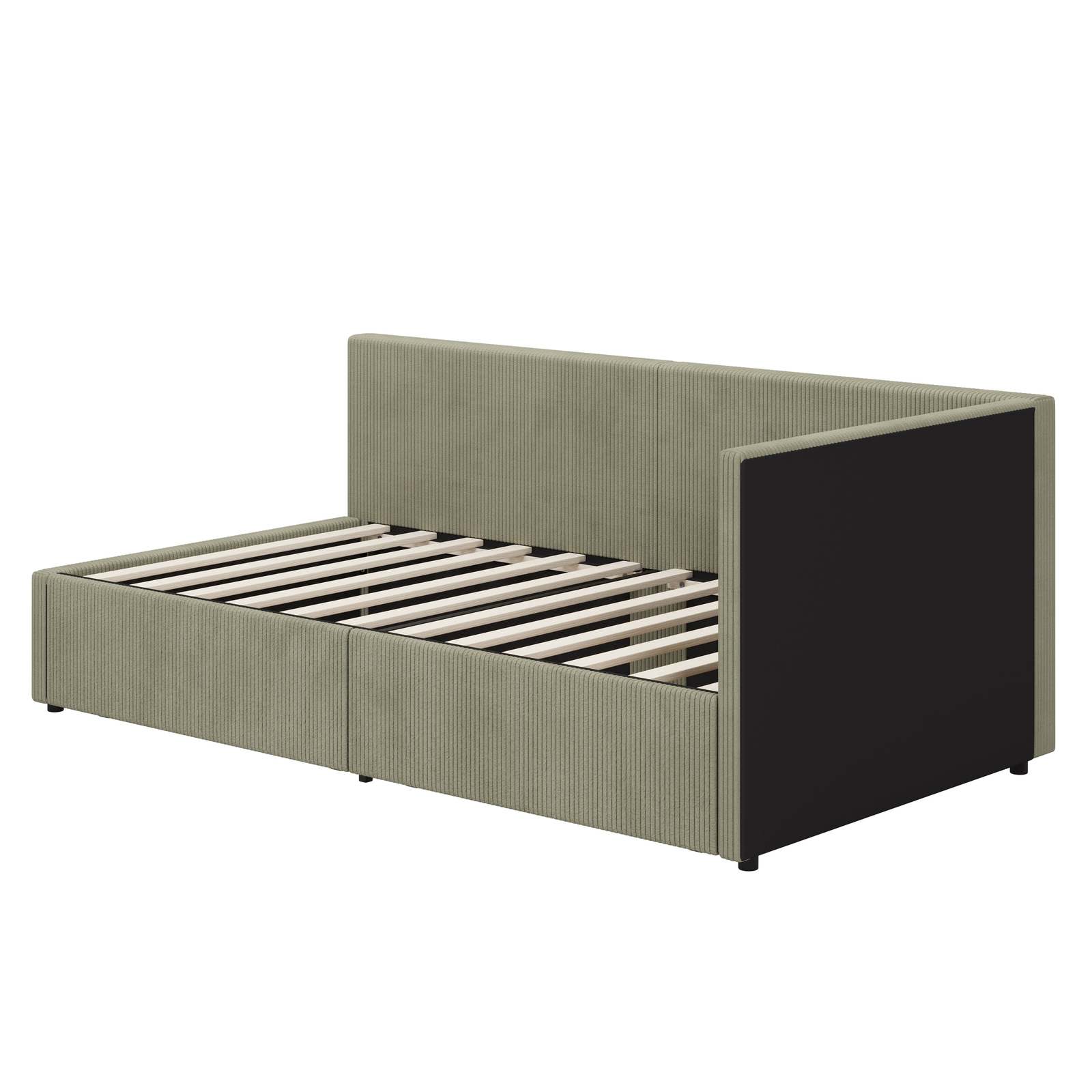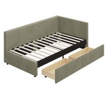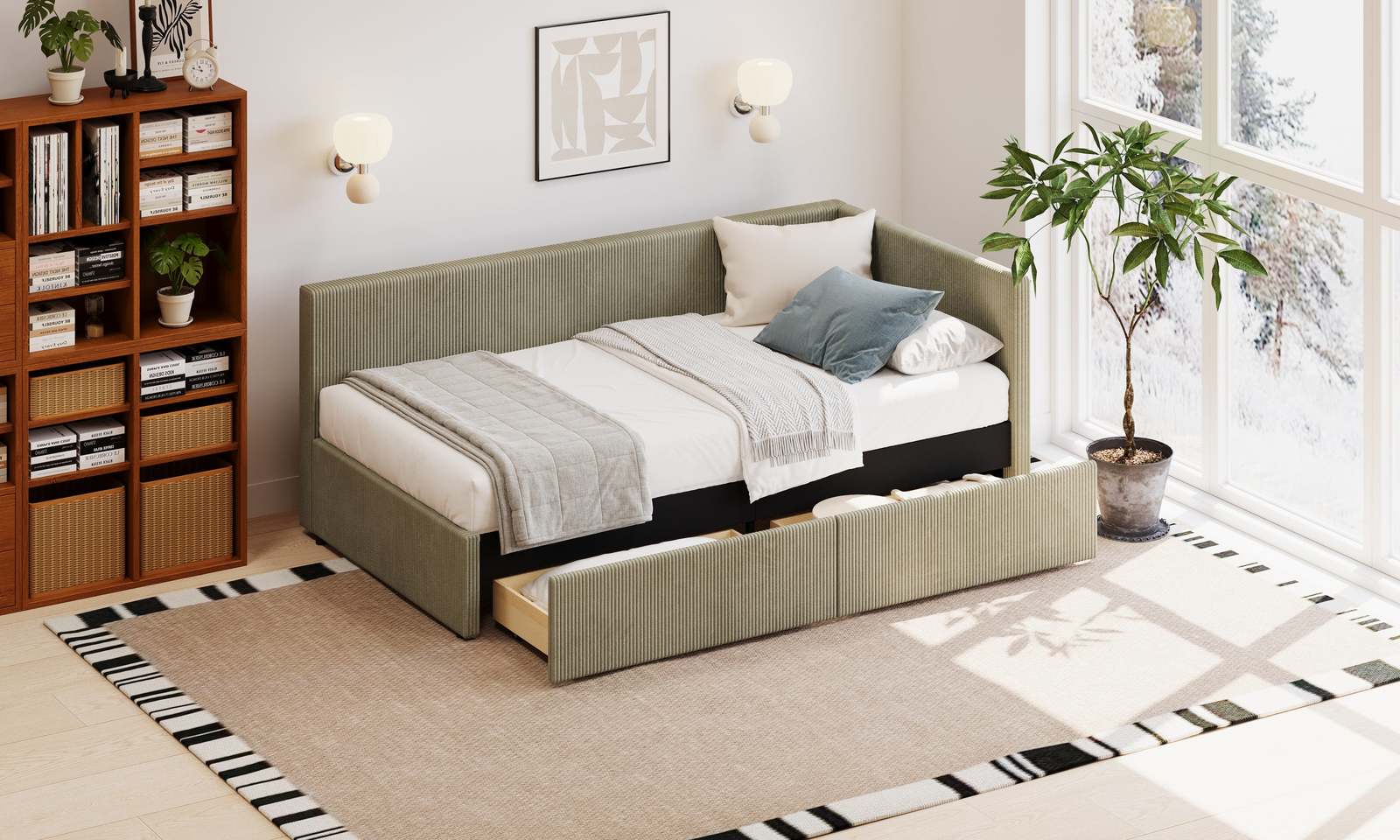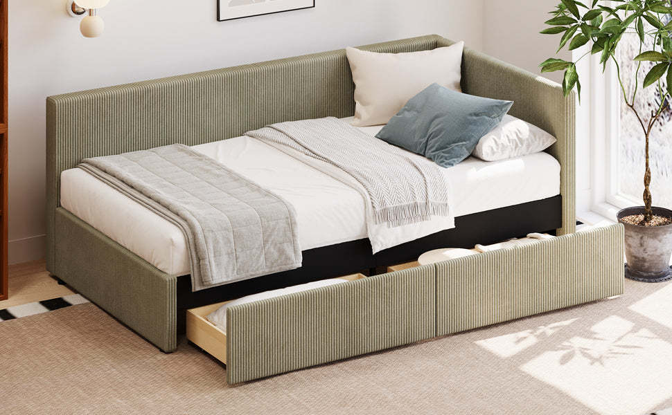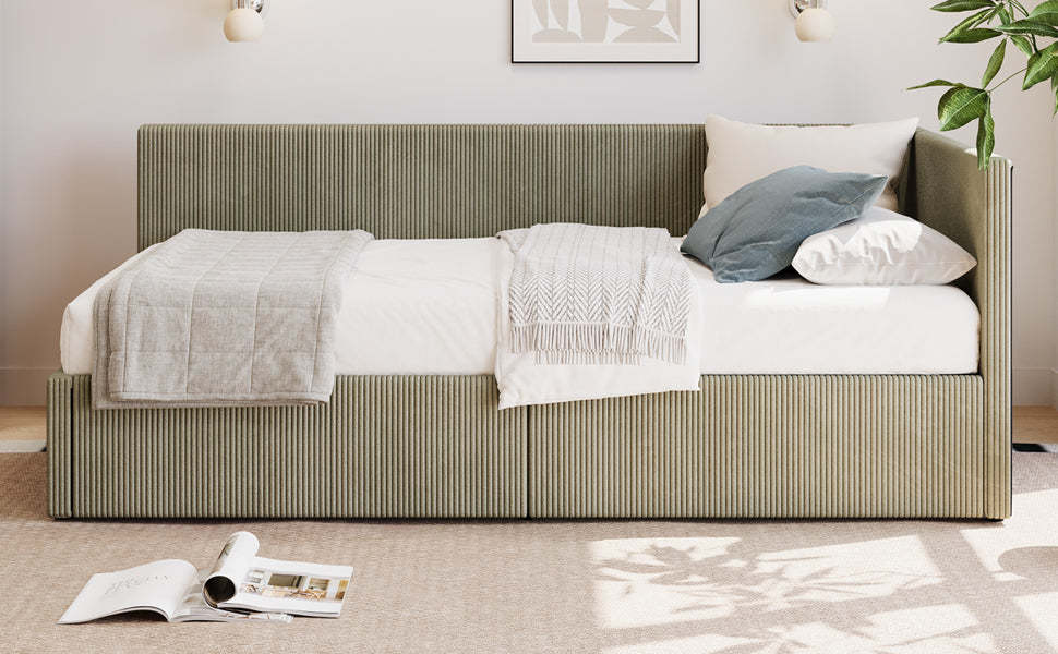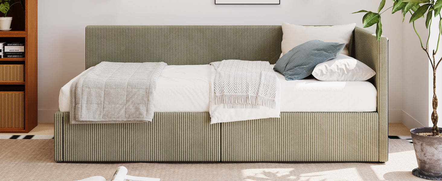 - Twin Modern L-Shape Daybed: Green Corduroy, Corner Storage Drawers
