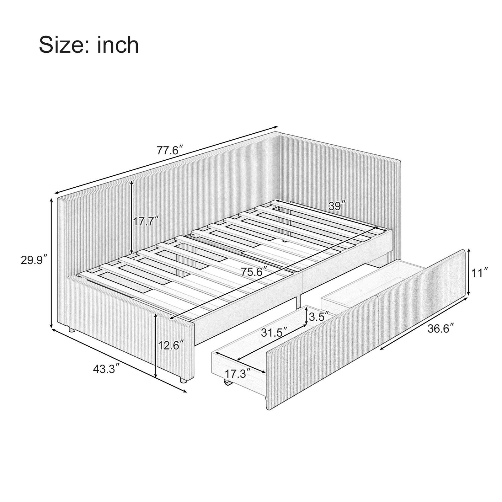 Transform your living space with the Modern L Shape Daybed Corner Bed, a perfect blend of style and functionality. Upholstered in plush corduroy with elegant vertical stripes, this daybed adds a touch of modern sophistication to any room. Its clever L shape design optimizes corner spaces, providing ample seating and a comfortable sleeping area without taking up too much room. Integrated storage drawers offer practical solutions for organizing essentials, making this piece ideal for both everyday lounging and accommodating overnight guests. Experience the ultimate in both comfort and convenience with this chic and versatile daybed.