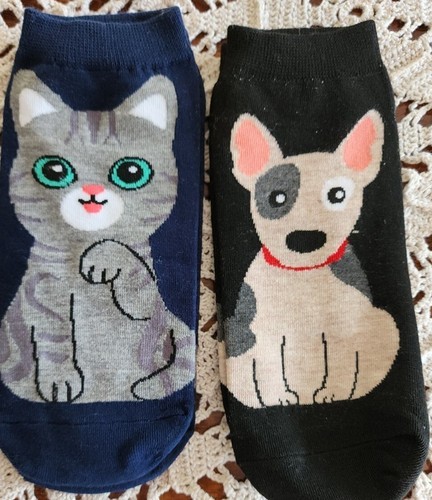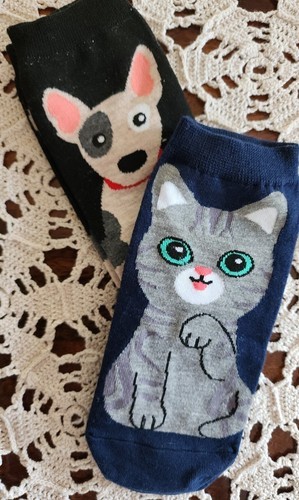 - Two (2) Pair ~ Animal Print ~ 1-Cat ~ 1-Dog ~ Knit ~ Ankle Socks (5)