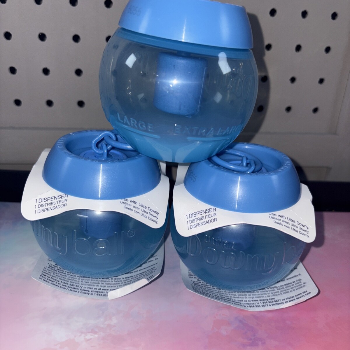 The product is a lot of 2 new and 1 open box Downy Ultra Downy Ball fabric softener dispenser balls. These reusable balls are designed for use in washing machines and are capable of providing softness for more than 100 loads. The blue balls come in a pack of 3 and are made with a liquid fabric softener that is easy to use. With features like automatic dispensing and a simple softness formula, these Downy balls offer convenience and effectiveness for laundry needs. Made in the United States, they are a practical addition to any household looking to simplify their laundry routine.